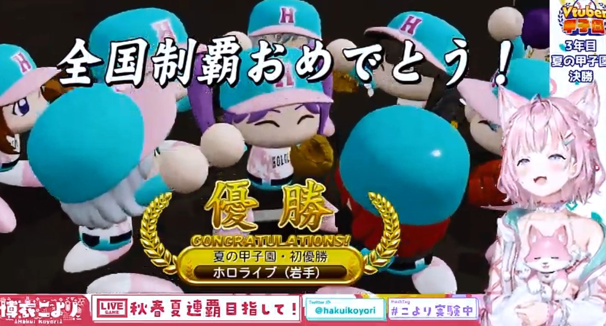 @EbjZnGHPWWCuraE#春のVtuber甲子園 打ち上げおつこよでした~! 改めて優勝おめちゃんだよ🎉色々な裏話をいっぱい聞けて楽しかったよ! めっちゃ熱く盛り上がった試合をありがとう!こよちゃんのパワプロ野球最高だ! #こより実験中
