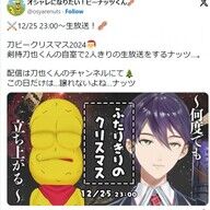 | 7度目の「刀ピークリスマス」今夜開幕 今年もバズは生まれるか、剣持刀也に愛は届くか …きだよ」という思いをリリックに乗せつつ、「刀ピー」の歴史を振り返り、「ろふまおやめて」と素直な思いを表現した楽曲に仕上げていた。こちらも1600万再生… (出典:クランクイン!) |